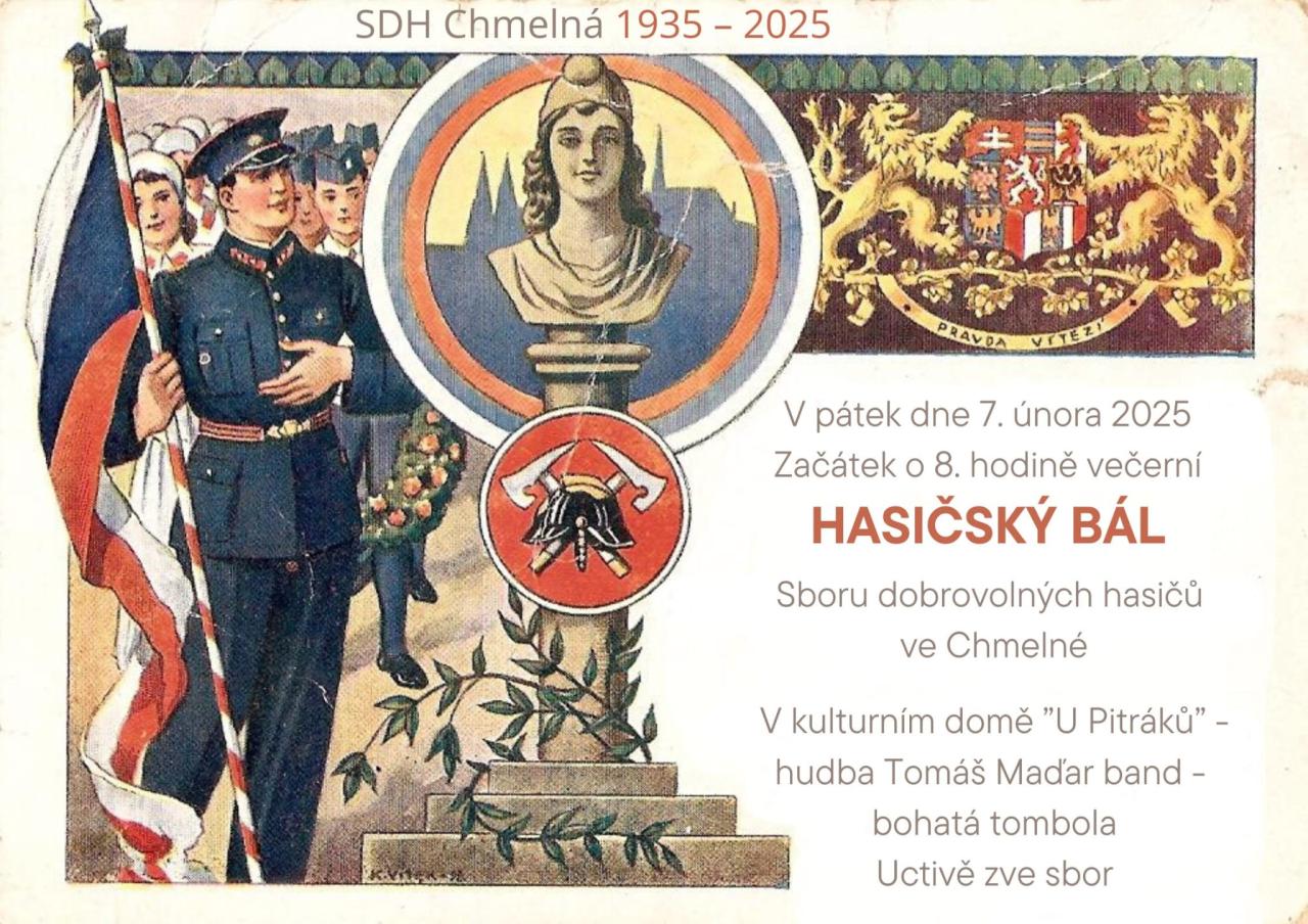 Přijměte pozvání na Hasičský bál pořádaný chmelenským sborem dobrovolných hasičů. Ten se uskuteční v pátek 7. února 2025 od 20:00 hodin v kulturním domě "U Pitráků" ve Chmelné. Bál je součástí oslav 90. výročí založení hasičského sboru ve Chmelné.